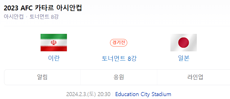 일본 대 이란의 8강전은 2월 3일 토요일 오후 8시 30분 에듀케이션 시티 스타디움에서 펼쳐집니다.