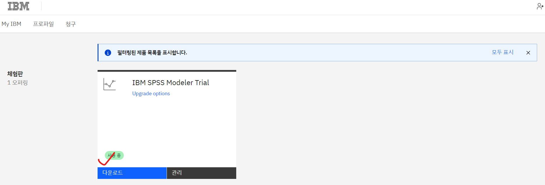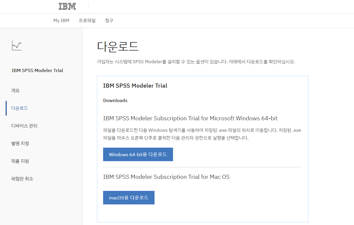 계정을 생성한 후 로그인을 하면 아래와 같은 체험판을 사용할 수 있는 화면으로 바뀝니다. 다운로드 라고 되어 있는 파란색 버튼을 클릭하면 SPSS를 다운받을 수 있습니다.