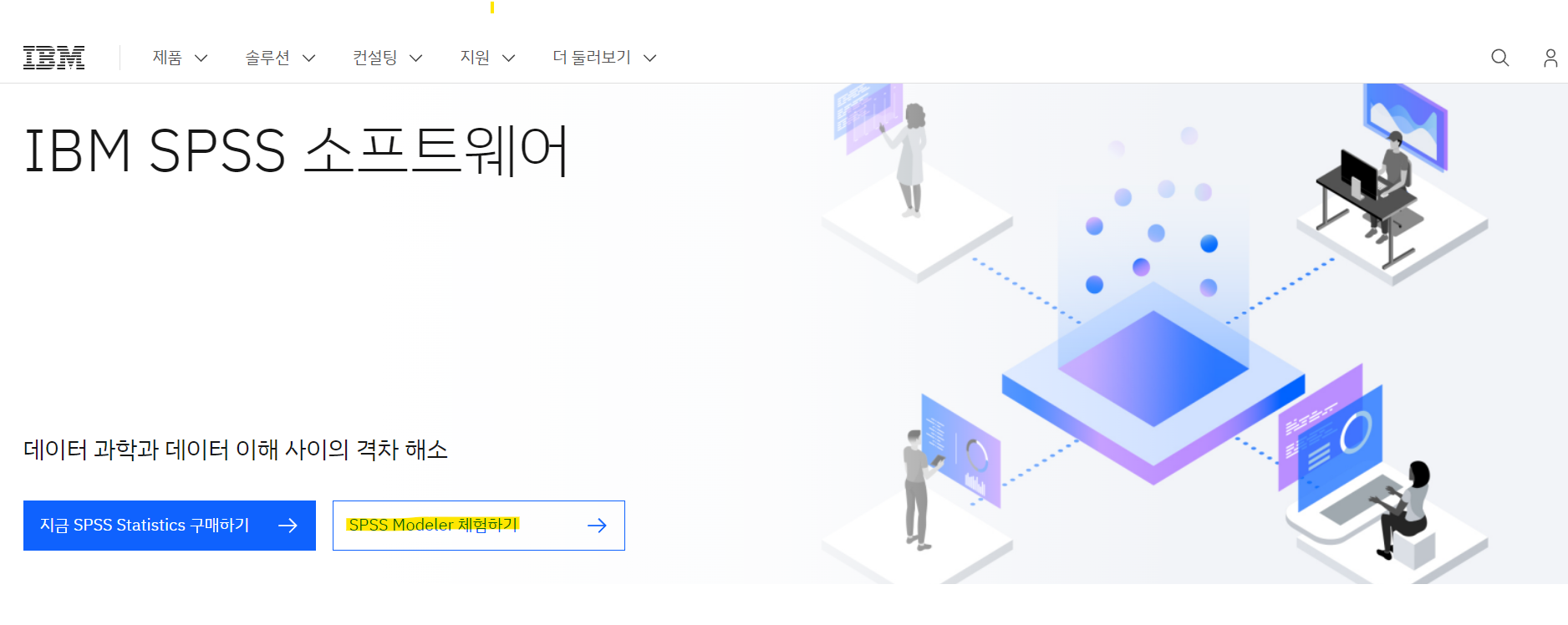 먼저, IBM SPSS를 다운받아야 합니다. IBM 공식 사이트 또는 아래 바로 가기 버튼을 눌러 사이트에 접속한 뒤 SPSS Modeler 체험하기를 클릭 후 다운받으면 되겠습니다.