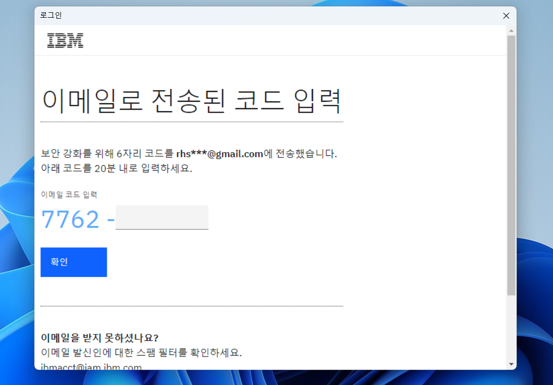 IBM 회원 가입을 한 ID와 비밀번호로 로그인을 하면 됩니다. 그러면 이메일로 코드가 전송이 되는데 그 코드를 이메일에서 확인한 뒤 입력을 해주시면 됩니다.