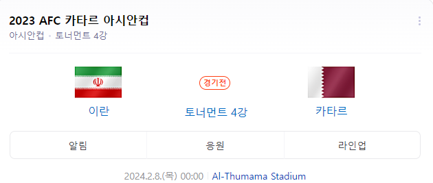이란 대 카타르의 아시안컵 4강 경기는 2월 8일 목요일 자정(00시)에 펼쳐질 예정입니다.