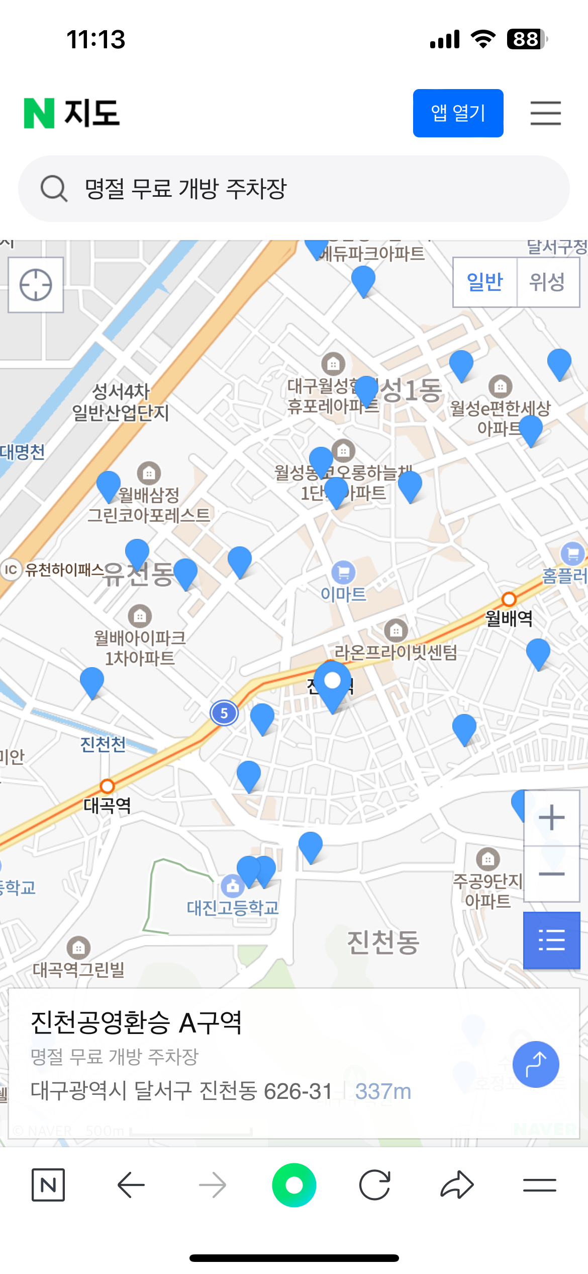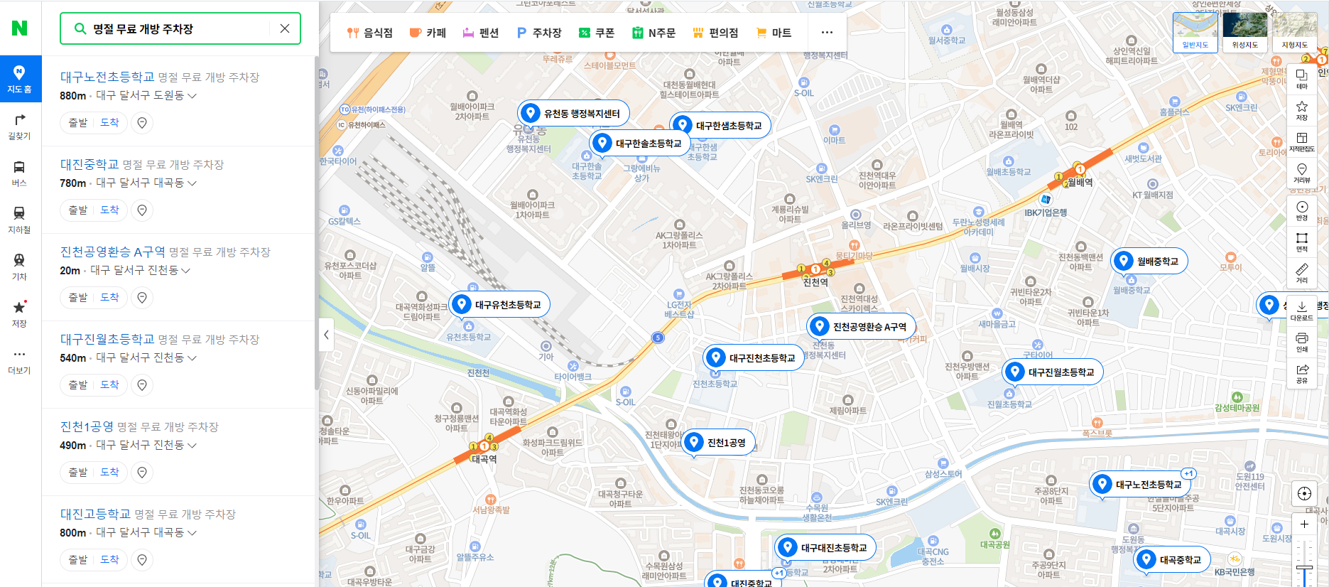 네이버 지도와 카카오 맵 어플 검색창에 '명절 무료 개방 주차장'이라고 검색하면 무료 개방 주차장을 찾을 수 있습니다.