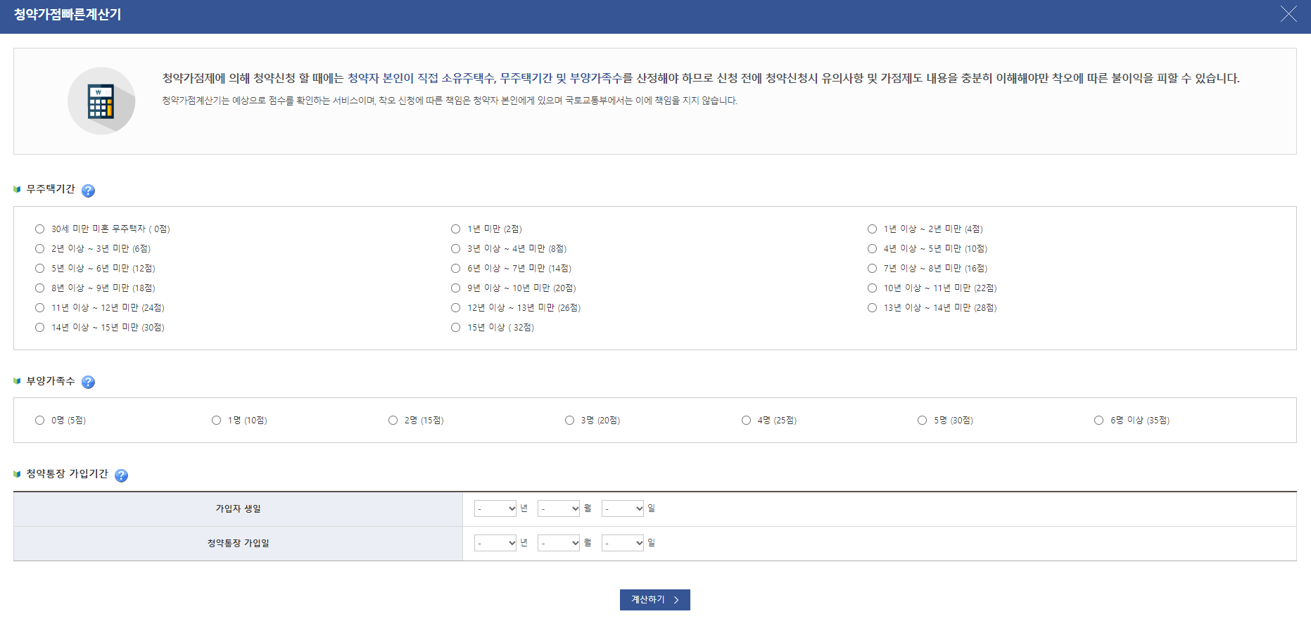 : 청약자격은 주택종류, 소득, 자산, 가구원수, 주거기간 등에 딸 ㅏ다르게 적용됩니다. 여기서 가장 중요한 것은 가점 계산입니다. 가점은 무주택기간과 부양가족수, 청약통장 가입기간 등을 점수로 환산하여 입주자를 선정하는 방식인데요. 청약가점 계산기를 이용하여 가점을 확인할 수 있습니다.