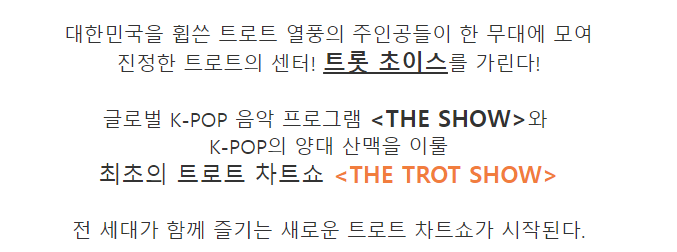 오늘 소개해 드릴 프로그램의 이름은 ‘더 트롯쇼’입니다.