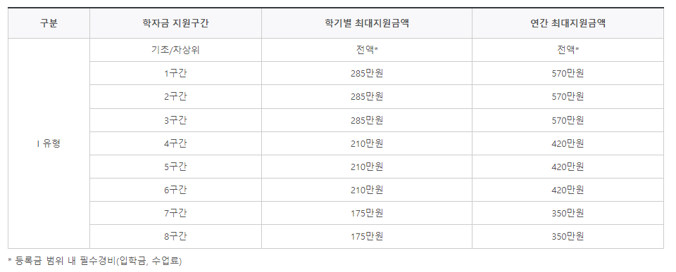 학자금 지원구간별로 해당 학기 등록금 필수경비(입학금, 수업료)를 초과하지 않는 범위 내에서 차등 지원이 됩니다.