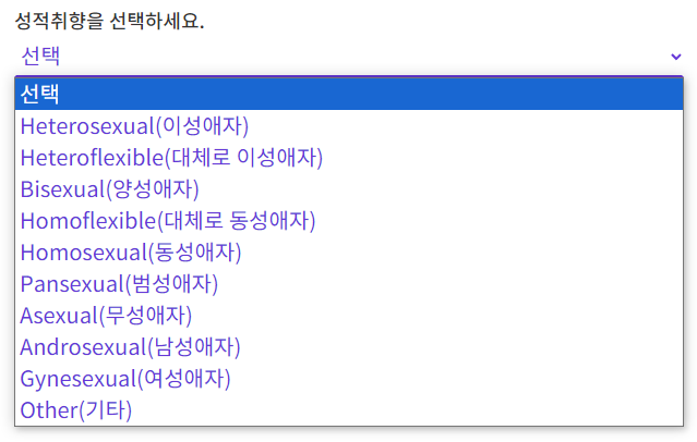 그 다음 성별을 선택합니다. 성별이 단순히 남자, 여자로 되어 있지 않습니다.