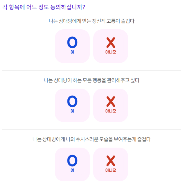 BDSM 초급문항의 경우 O,X로 된 문항들을 체크하시면 됩니다.