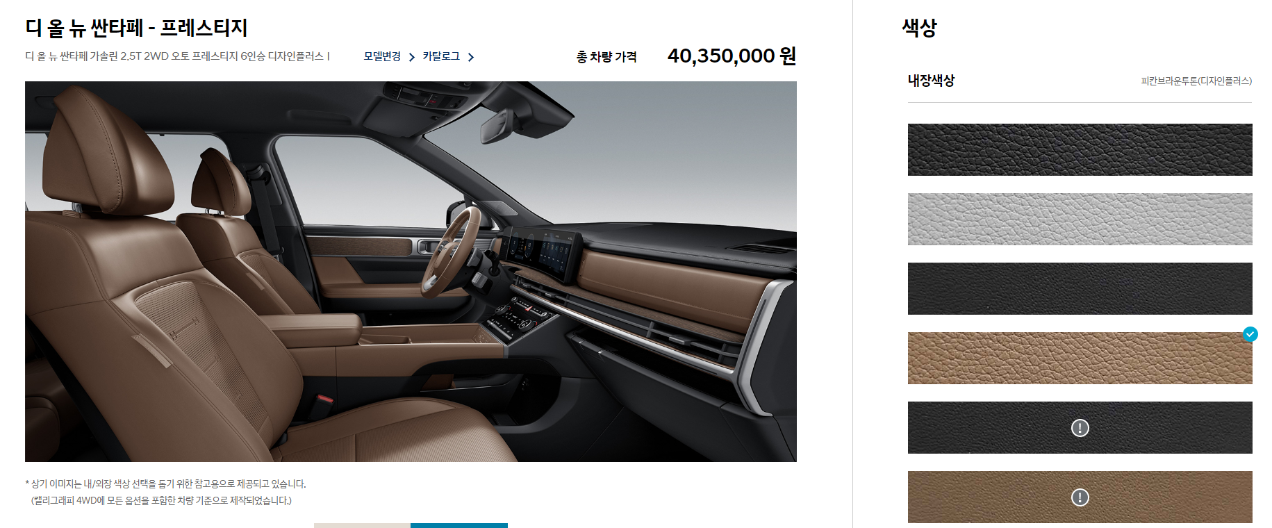 기본적인 시트 내장 색상으로는 4종류가 있습니다. 블랙 모노, 블랙 모노 (디자인 플러스), 그레이 투톤, 피칸브라운 투톤(디자인플러스) 입니다. 예시 사진은 피칸 브라운 투톤 사진입니다.
