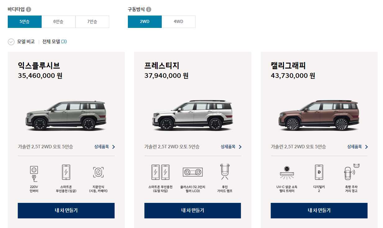 신형 싼타페의 트림은 익스클루시브, 프레스티지, 캘리그래피 3가지입니다. 기본 모델 익스클루시브의 깡통(무옵션) 기준 차값은 3546만원, 하이브리드 모델이 4,031만원입니다.
