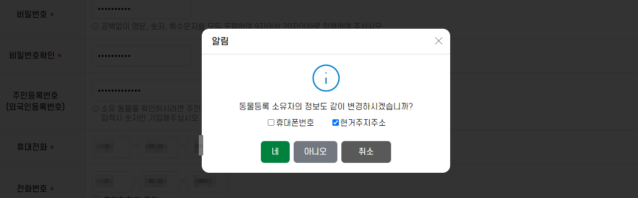 귀찮으시더라도 인증을 해주셔야 동물등록번호 정보 변경 신청이 가능합니다.