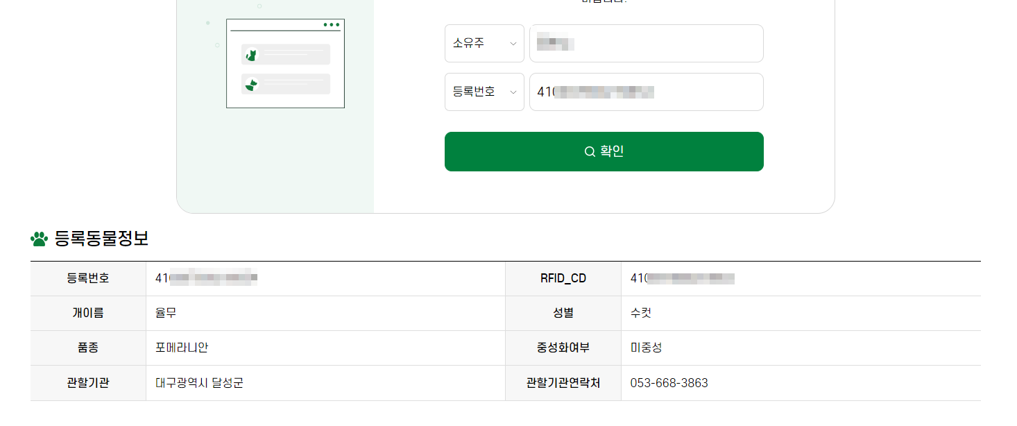 그 다음 소유주와 등록번호를 입력하면 동물등록 확인이 가능합니다.