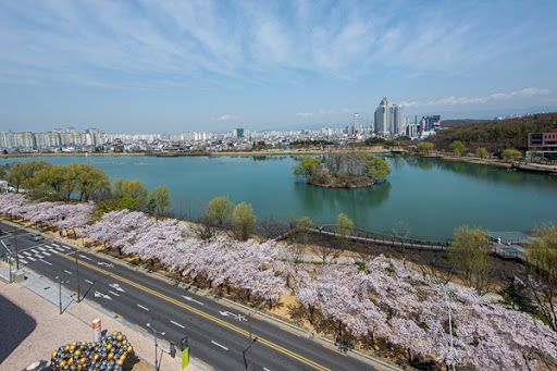 - 수성못에 심어져 있는 대부분의 나무가 벚나무라 벚꽃 시즌에 가면 온통 연핑크로 물들어져 있어 예쁜 벚꽃을 배경으로 사진을 찍을 수 있습니다.