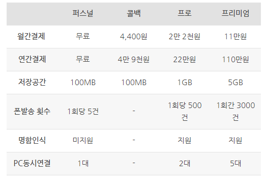 콜백 서비스만 단독으로 신청하면 월 4400원으로 저렴합니다. 기업에서 사용할 경우, 문자 발송 한도가 높은 프로 또는 프리미엄 서비스를 결제하는 것을 추천합니다.