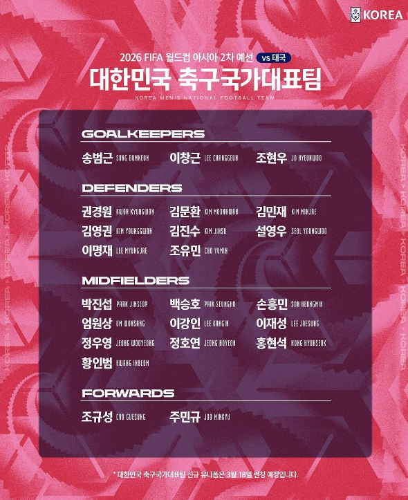 대한민국 대 태국 북중미 월드컵 2차 예선 대표팀 명단