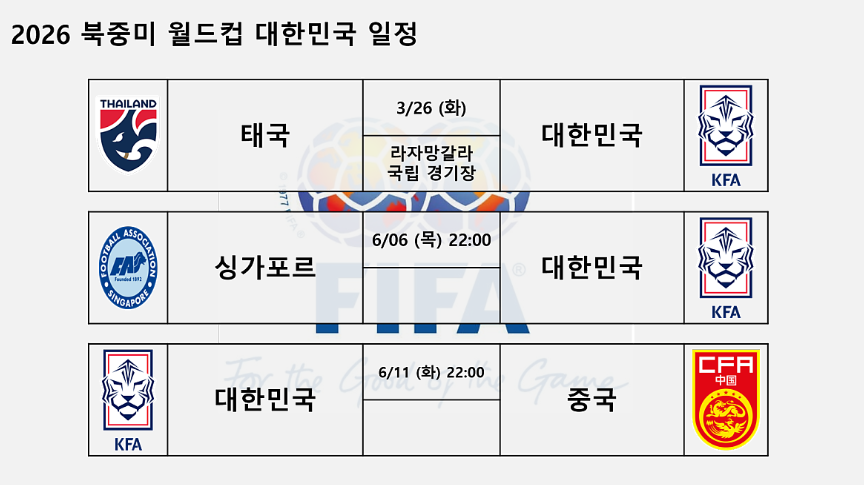 2026 북중미 월드컵 대한민국 대표팀의 일정은 다음과 같습니다.