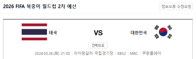 3월 26일 오후 9시 30분 대한민국과 태국의 2026 북중미 월드컵 2차 예산 2차전 경기가 태국 라자망갈라 국립경기장에서 펼쳐질 예정입니다.