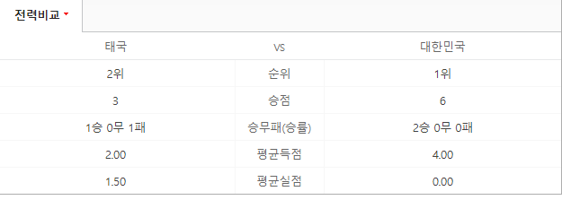 태국은 1승 1무 1패로 승점 4점으로 2위를 달리고 있어 C조 1, 2위 간의 맞대결이라 보시면 됩니다.