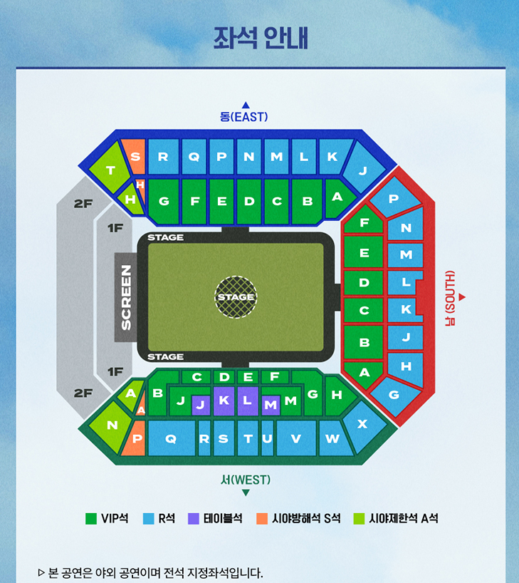 시야방해석S석은 북측에 설치되는 스크린 시야가 확보되지 않고 북측 무대에서 진행되는 일부 연출의 시야 방해가 있는 좌석이니 이점 참고하시기 바랍니다.