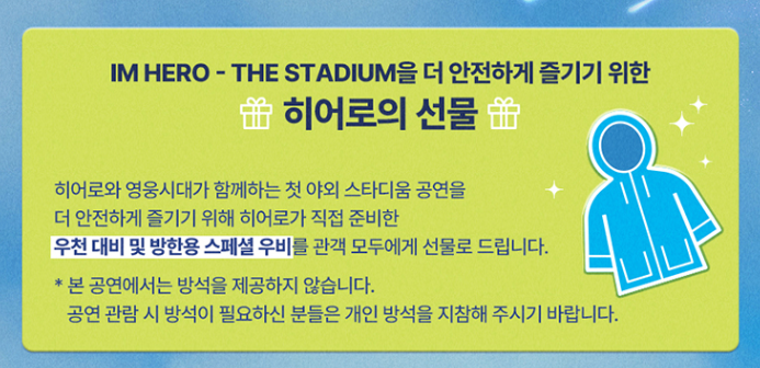이번 임영웅 콘서트를 예매하면 당일 우천 대비 및 방한용 스페셜 우비를 관객 모두에게 선물로 준다고 합니다.