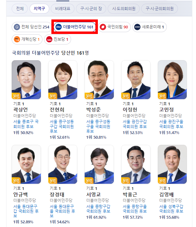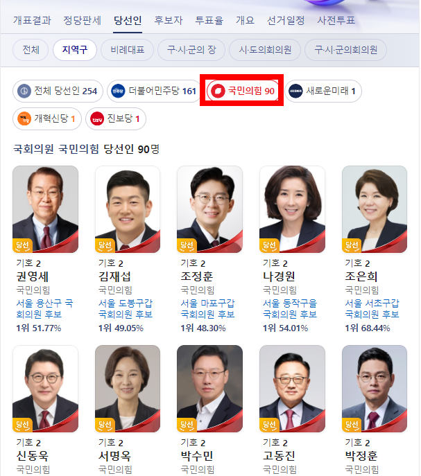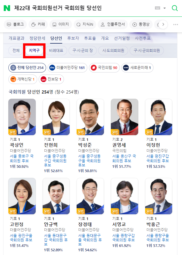 포털사이트 검색창에 '제22대 국회의원선거 당선인'이라고 검색을 하면 전체 당선인 254명을 서울, 부산, 대구, 인천 순으로 확인할 수 있습니다.