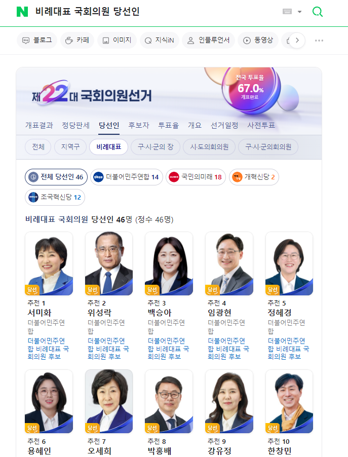 포털사이트에서 '비례대표 국회의원 당선인'을 검색하면 비례대표 당선인을 확인할 수 있습니다.