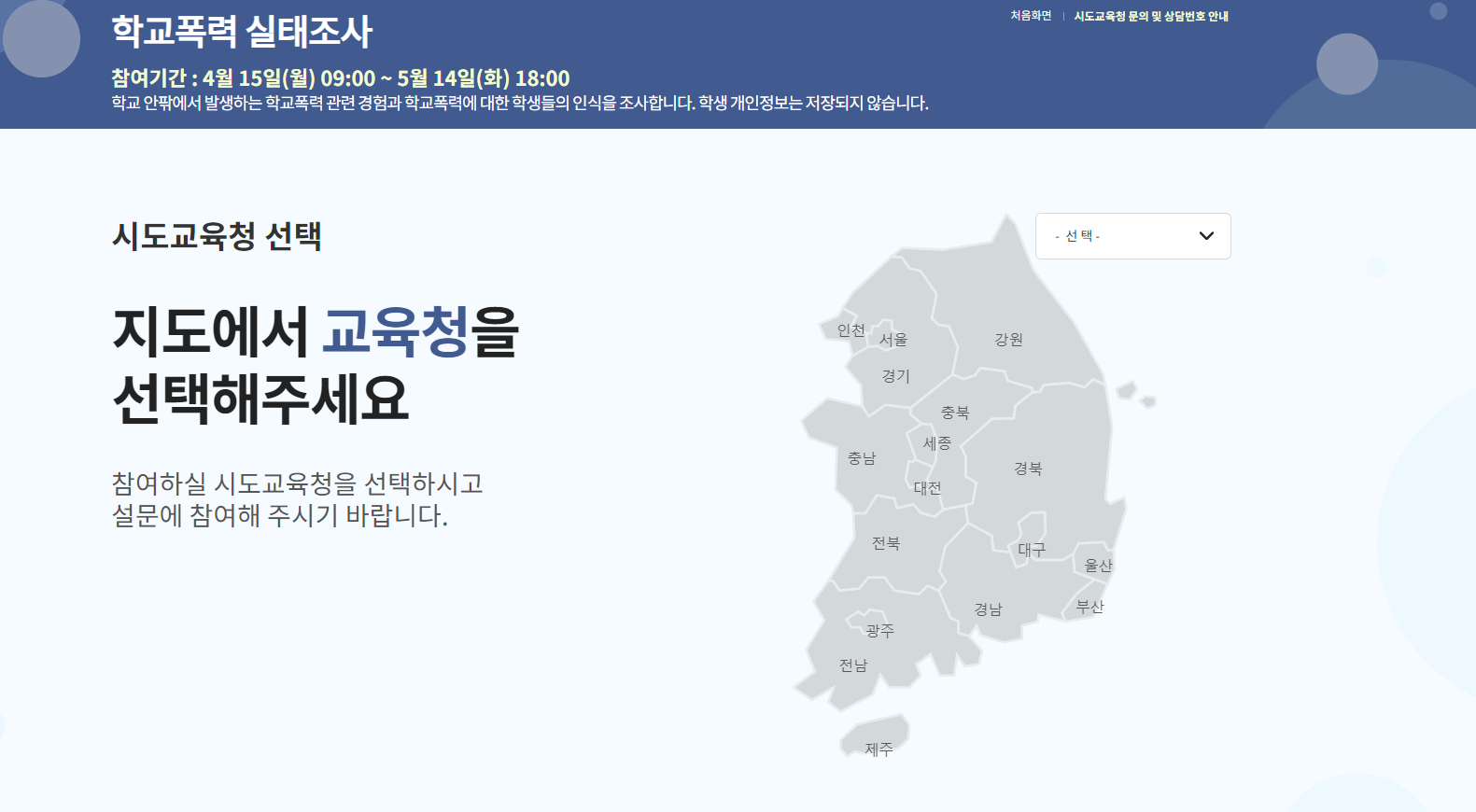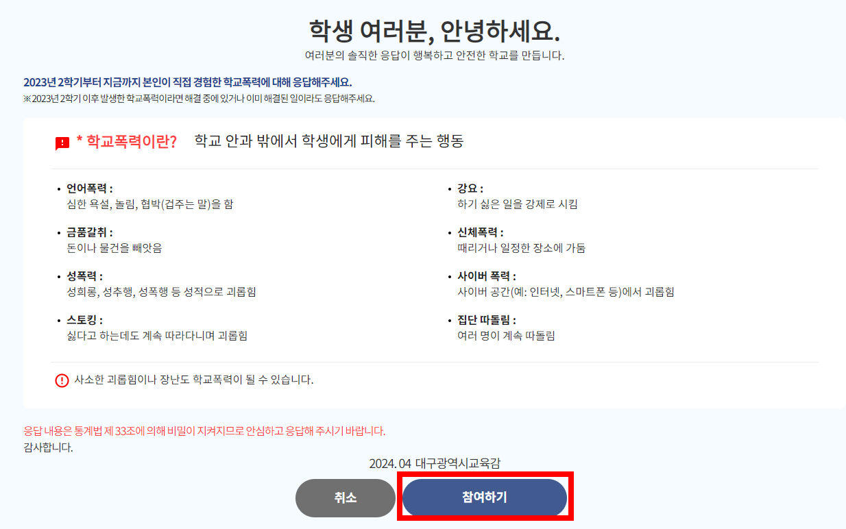 2024년 학교폭력 실태조사 1차가 4월 15일 월요일 오전 9시 부터 5월 14일 화요일 오후 6시 까지 진행됩니다.