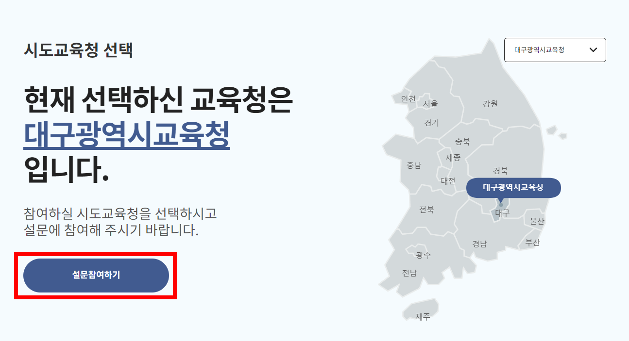 - 학교명, 학년, 참여번호를 입력하고 '설문시작' 버튼을 클릭하여 학적을 확인하고 설문조사를 시작합니다.