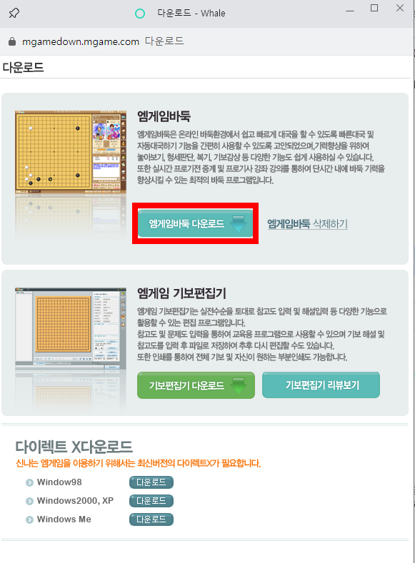 다운로드를 클릭하면 다운로드 팝업창이 뜹니다. 여기서 '엠게임바둑 다운로드'를 클릭해주세요.