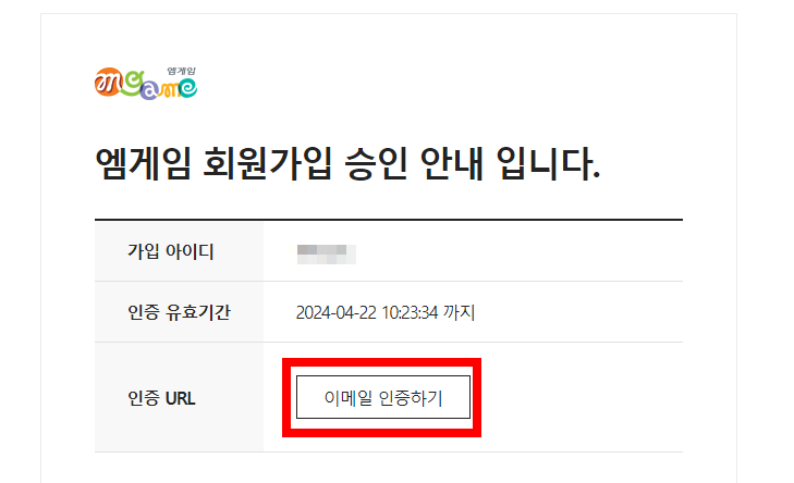 메일함에 들어가서 엠게임에서 온 메일을 클릭하고 이메일 인증하기를 클릭해주세요.