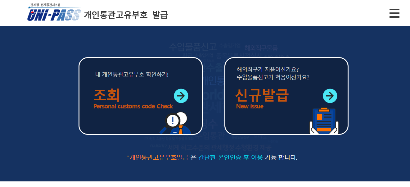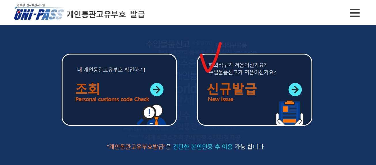먼저, 개인통관고유부호 발급 사이트로 이동합니다. 신규발급 버튼을 클릭합니다.