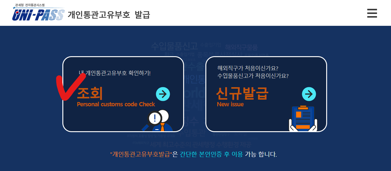 개인통관번호를 분실한 경우 위의 사이트에 다시 접속해서 조회 버튼을 클릭합니다.