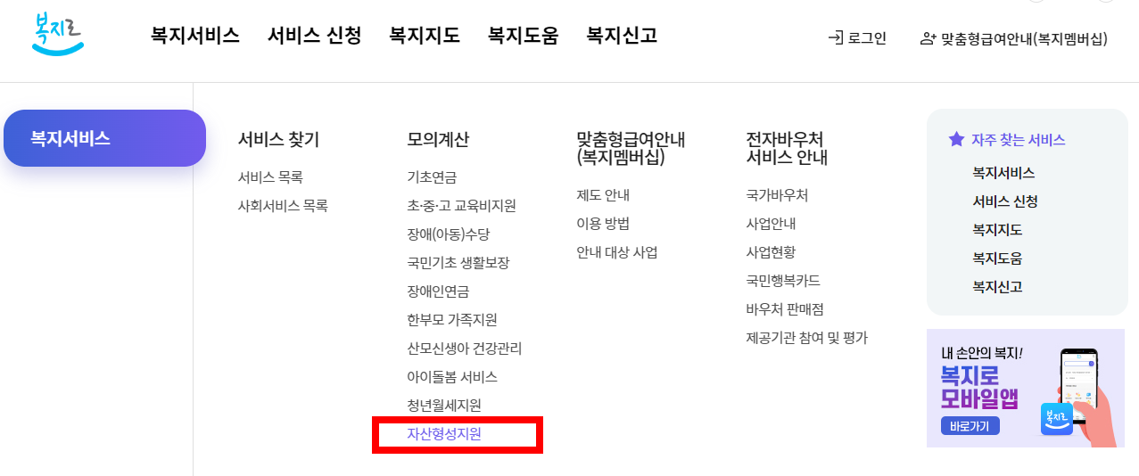 📌 복지로 사이트 이동 > 복지로 로그인 > 복지 서비스 신청 > 복지 급여 신청 > 저소득층 > 자산형성지원