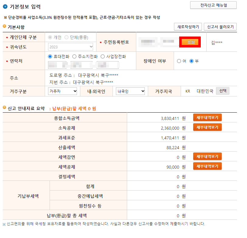 기본사항을 입력해야 합니다. 주황색으로 된 '조회' 버튼을 클릭합니다.