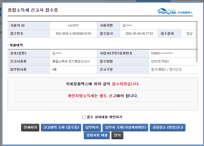 그러면 종합소득세 신고서 접수증 화면이 아래와 같이 뜹니다.