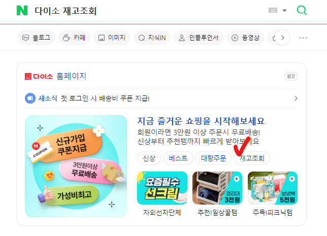 먼저, 포털사이트에서 '다이소 재고조회'를 검색합니다. 그 다음 아래 사진 처럼 재고조회를 클릭합니다.