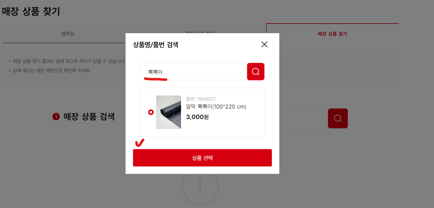매장 상품찾기로 이동을 하는데 여기서 찾고자 하는 상품을 검색하면 됩니다.