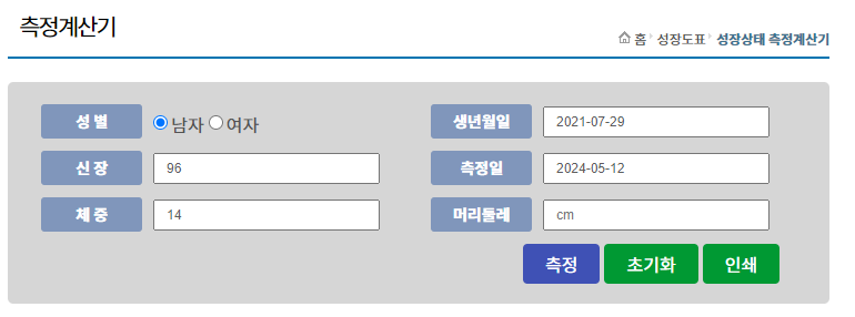 2️⃣ 아이의 나이, 키, 몸무게 등 필요한 정보를 입력한 뒤 측정 버튼을 클릭합니다.