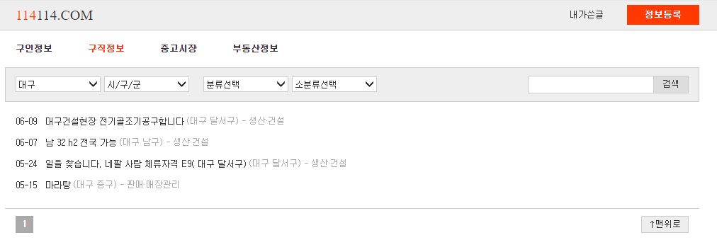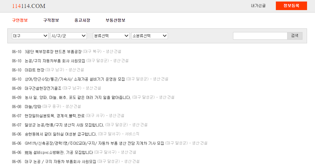 현재 대구 지역 내에 올라 온 구인광고를 볼 수 있습니다. 농사나 건설현장, 공장 2-3교대 일에 대한 구인 글이 많이 올라와 있는 것을 볼 수 있습니다.