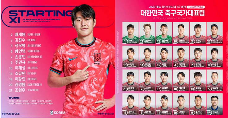 싱가폴을 7대 0으로 대파한 대한민국 축구 대표팀이 오늘 6월 11일 상암월드컵 경기장에서 중국과 북중미 월드컵 2차 예선을 치룹니다.