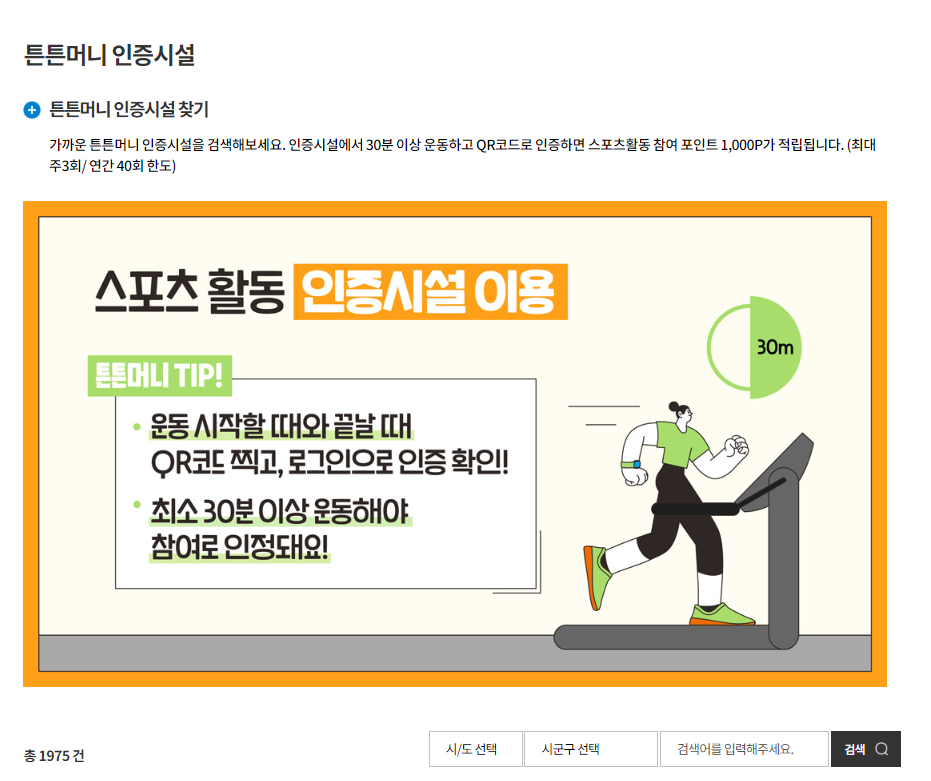 운동시간은 최소 30분 이상이어야 하고, 꼭 튼튼머니 인증시설에서 운동을 해야 합니다. 운동을 하면 한 번에 1000포인트씩 일주일에 세번 까지 튼튼머니를 적립할 수 있습니다.