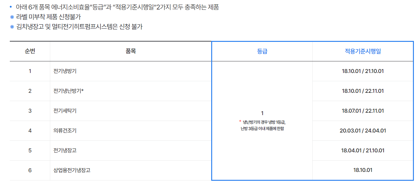 아래의 6개 품목 에너지소비효율 등급과 적용기준시행일 2가지 모두를 충족하는 제품이어야 합니다.