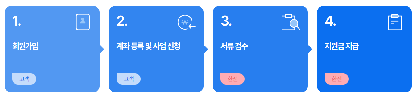 먼저 한전 회원가입을 해야 합니다. 그 다음 계좌등록 및 사업 신청에 들어가 소상공인 에어컨 구입비 지원 관련 서류를 첨부하면 됩니다.