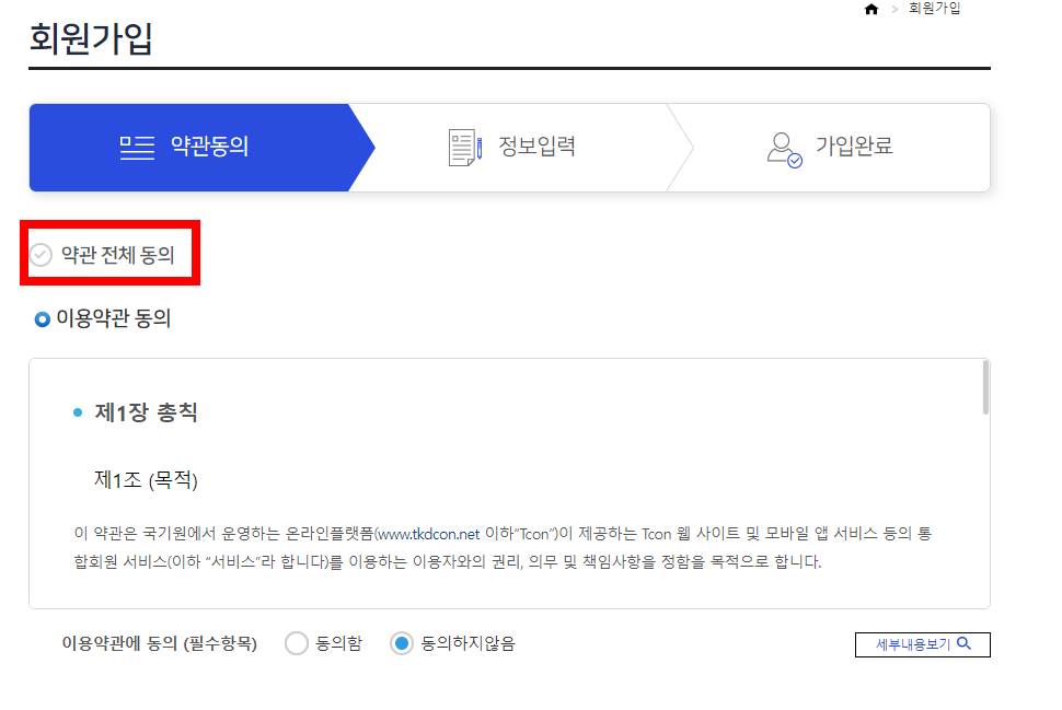 약관은 전체 동의를 클릭하면 일일히 클릭하지 않아도 됩니다.