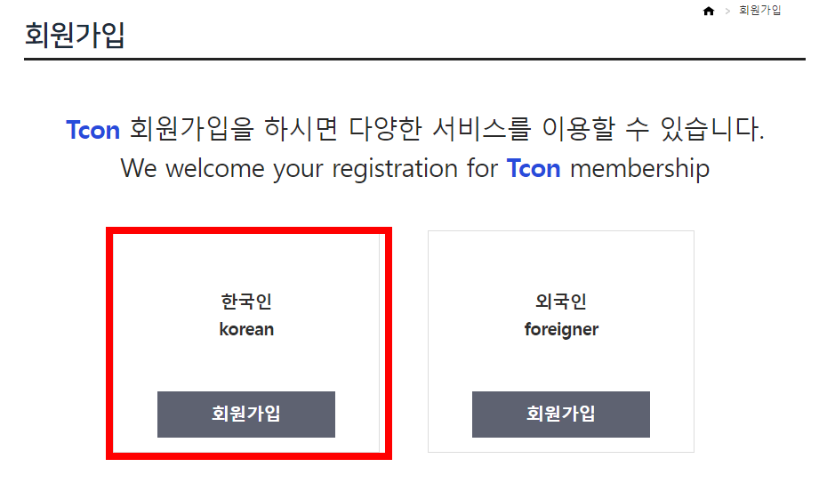 회원가입을 클릭하면 한국인과 외국인 선택창이 뜹니다.