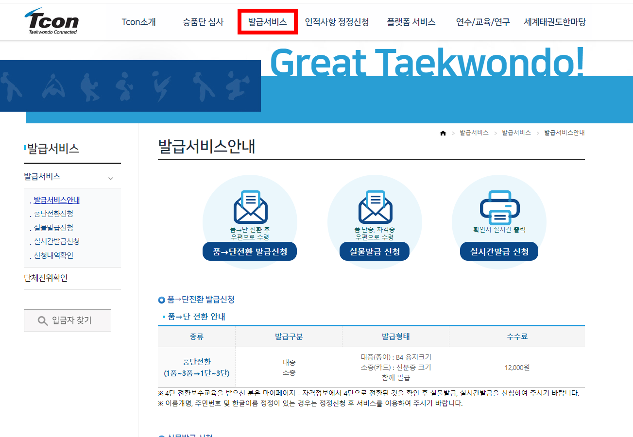 티콘 사이트에 접속한 뒤 회원가입을 하면 마이페이지에서 자신이 취득한 태권도 단증(품증)의 번호와 취득연도를 확인할 수 있습니다.