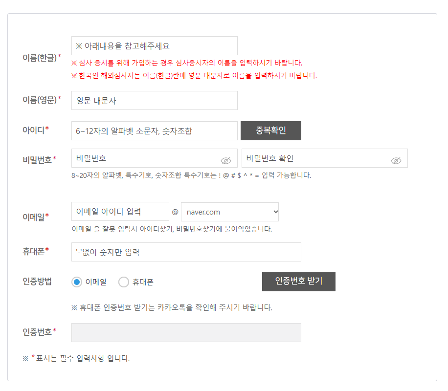 그 다음 이름과 아이디, 이메일, 휴대폰번호를 입력한 뒤 인증번호를 발급받아 인증을 마쳐주세요.
