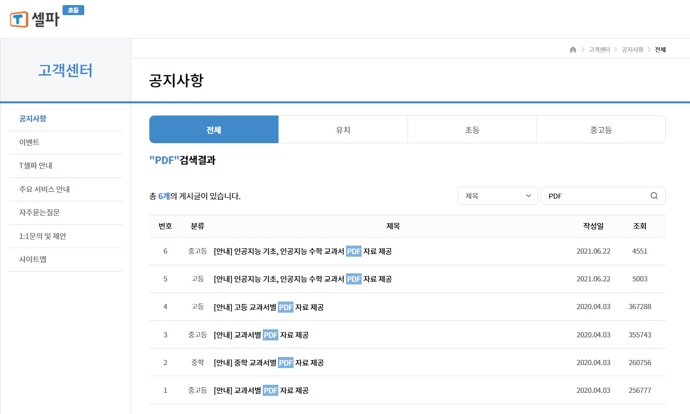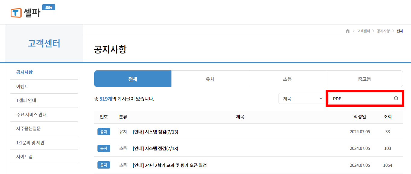 고객센터로 이동을 했다면 검색창에 PDF를 입력해주세요.