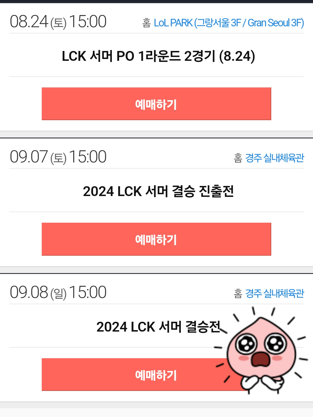 2024 LCK 서머 결승전이 9월 8일 경주 실내체육관에서 개최힙니다. 2024년 8월 19일과 20일에 결승 티켓 예매를 할 수 있는데 롤의 인기가 좋아 피케팅이 될 거 같습니다.