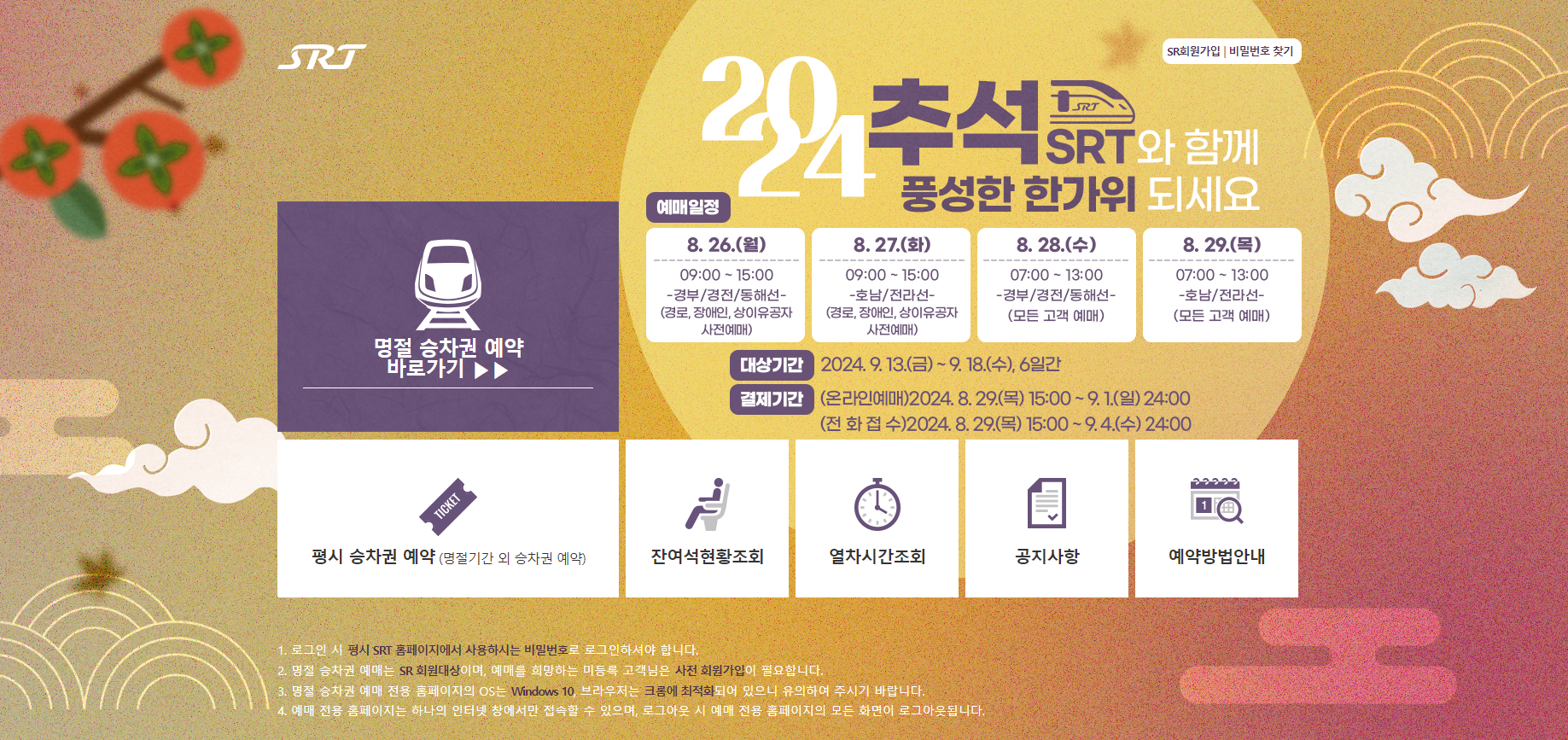 SRT는 8월 26일 부터 4일 동안 추석 기차표 예매를 실시합니다. 9월 13일 부터 18일 사이에 운행하는 모든 SRT 열차가 예매 대상입니다.