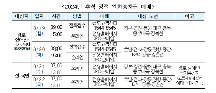 • 예매 방법 : 온라인(코레일 홈페이지) 또는 전화